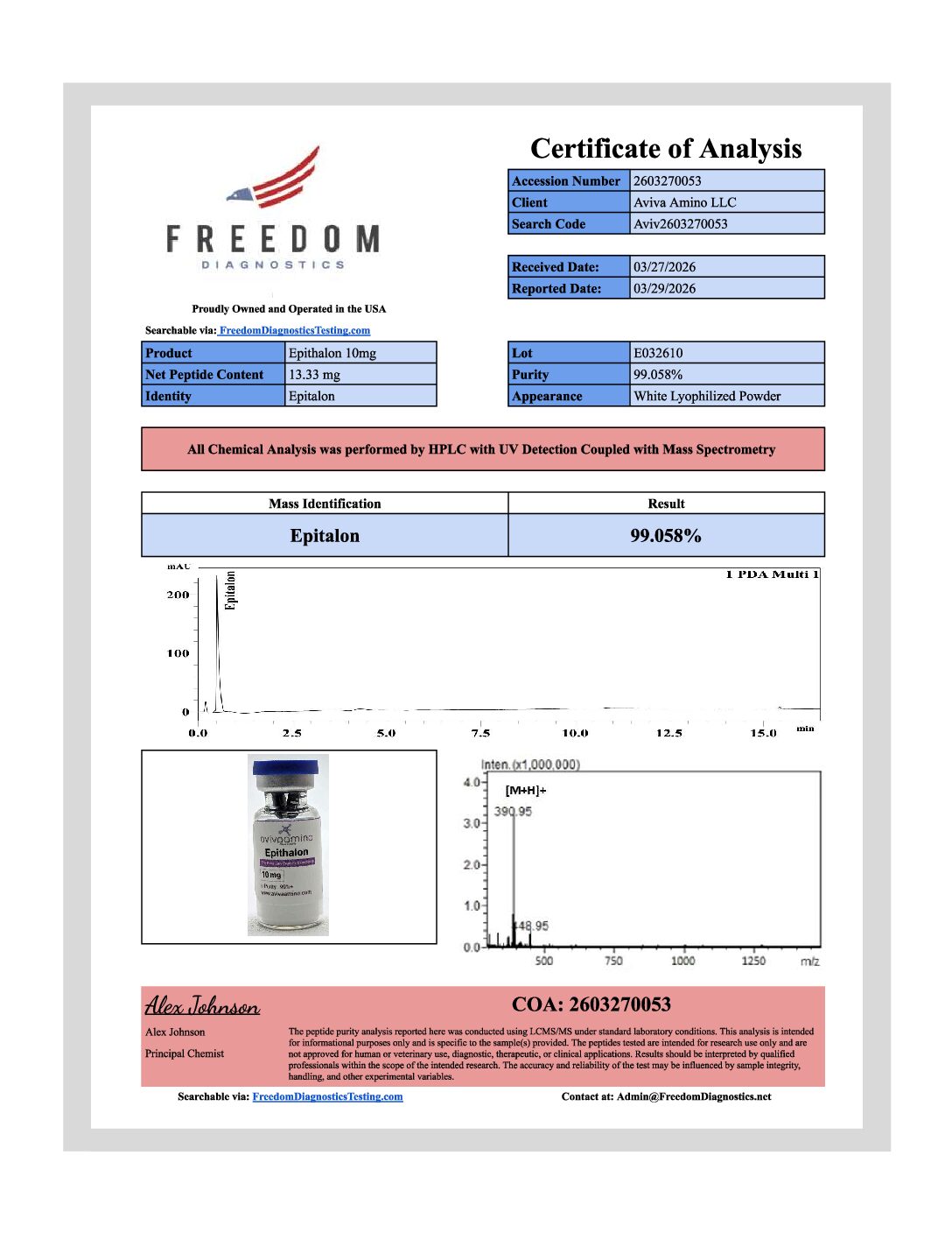 Epithalon is a synthetic tetrapeptide composed of alanine, glutamic acid, aspartic acid, and glycine arranged in a linear sequence. Its compact structure makes it a useful reference molecule for studying short-chain peptide stability, sequence-specific folding behavior, and chromatographic identification. Epithalon is commonly utilized in research environments focused on purification profiling and analytical characterization of minimal-length peptide analogs.